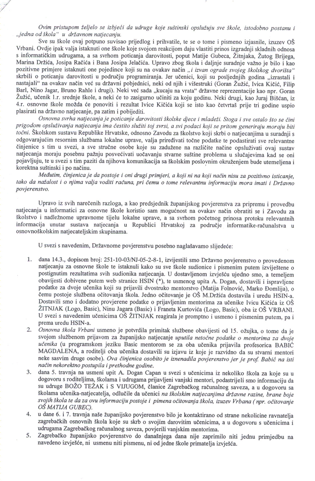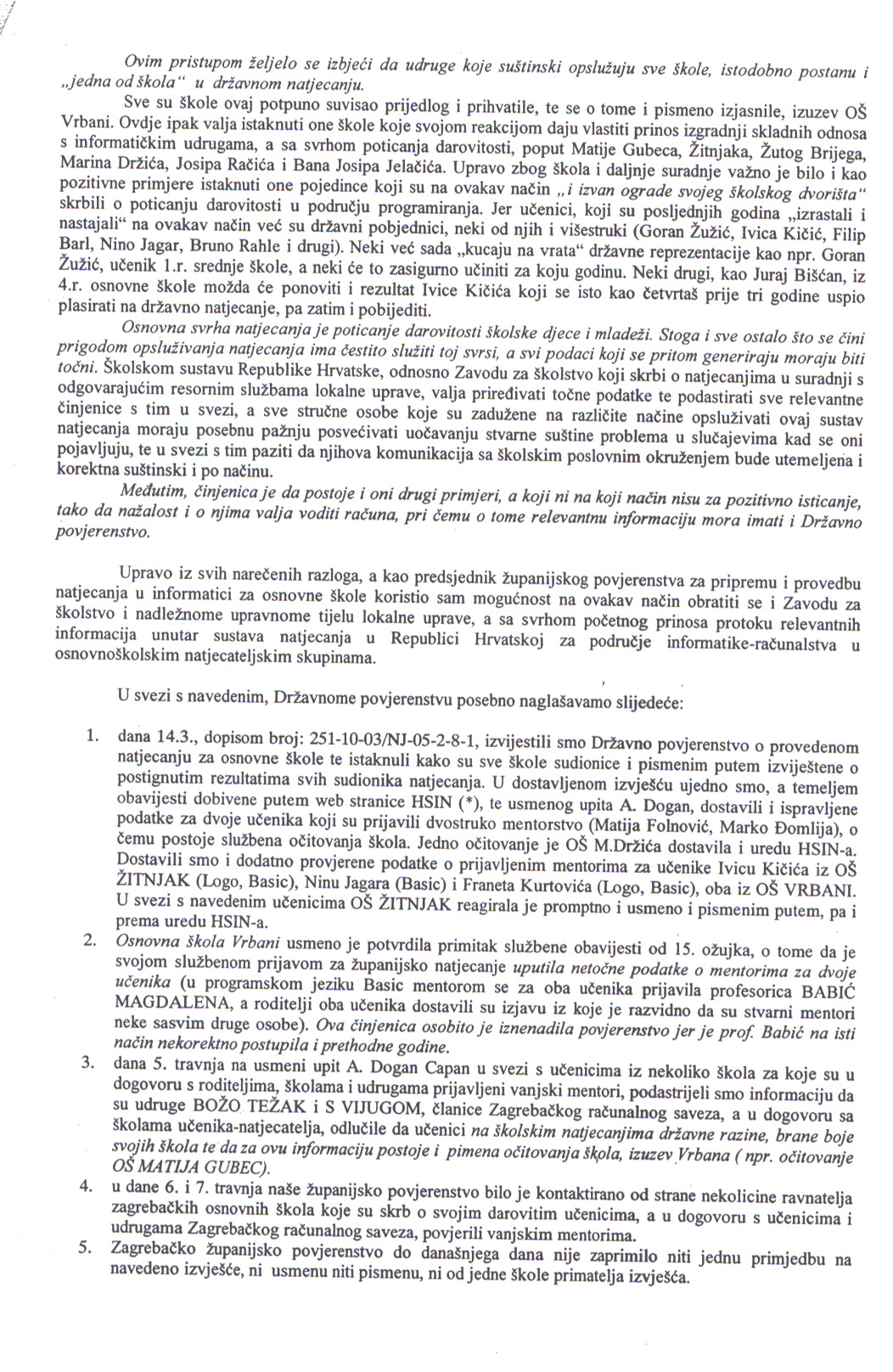 - dana 14.3., dopisom broj: 251-10-03/NJ-05-2-8-1, izvijestili smo Državno povjerenstvo o provedenom natjecanju za osnovne škole te istaknuli kako su sve škole sudionice i pismenim putem izviještene o postignutim rezultatima svih sudionika natjecanja. U dostavljenom izvješću ujedno smo, a temeljem obavijesti dobivene putem web stranice HSIN (*), te usmenog upita A. Dogan, dostavili i ispravljene podatke za dvoje učenika koji su prijavili dvostruko mentorstvo (Matija Folnović, Marko Đomlija), o čemu postoje službena očitovanja škola. Jedno očitovanje je OŠ M.Držića dostavila i uredu HSIN-a. Dostavili smo i dodatno provjerene podatke o prijavljenim mentorima za učenike Ivicu Kičića iz OŠ ŽITNJAK (Logo, Basic), Ninu Jagara (Basic) i Franeta Kurtovića (Logo, Basic), oba iz OŠ VRBANI. U svezi s navedenim učenicima OŠ ŽITNJAK reagirala je promptno i usmeno i pismenim putem, pa i prema uredu HSIN-a.