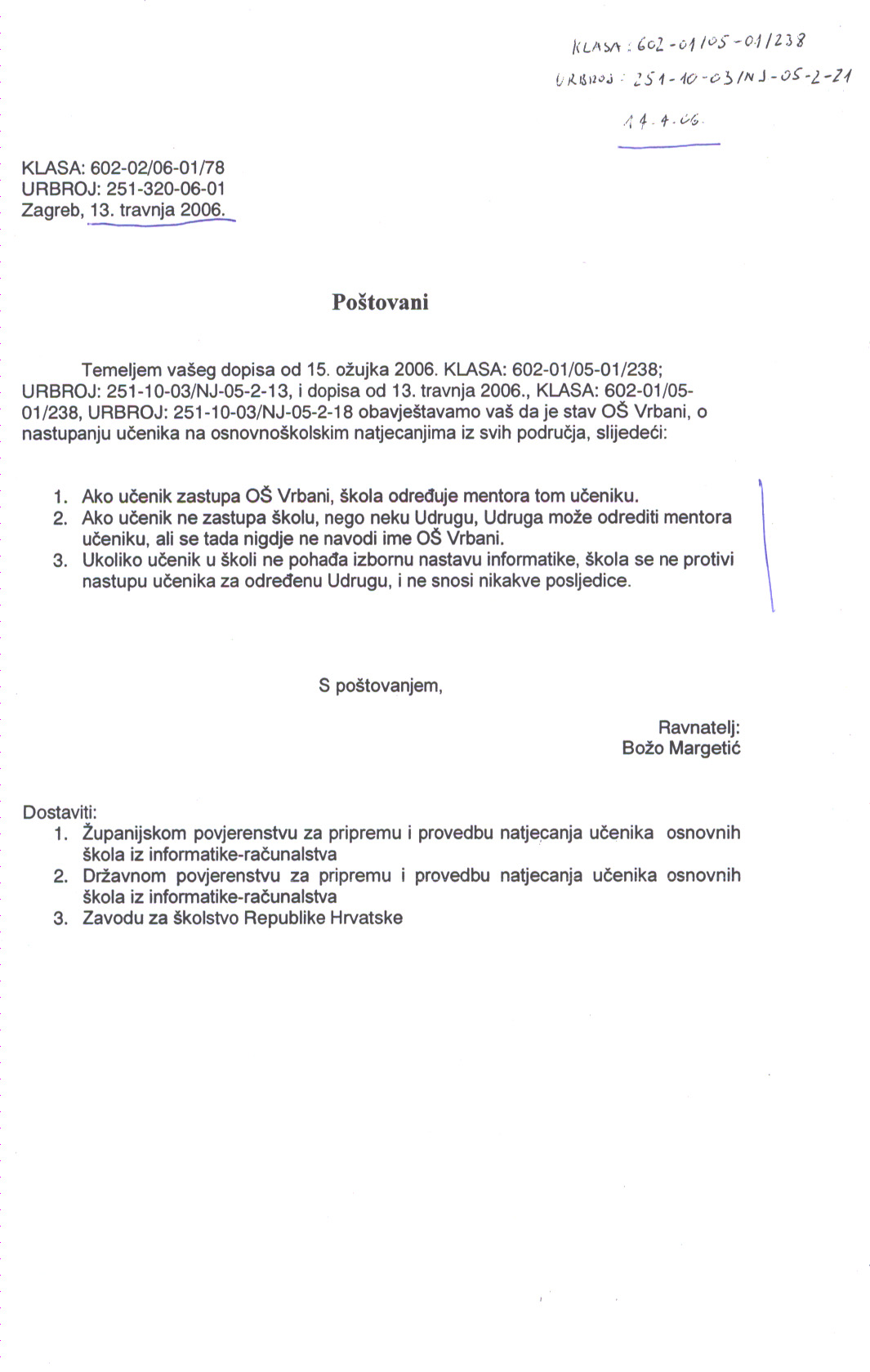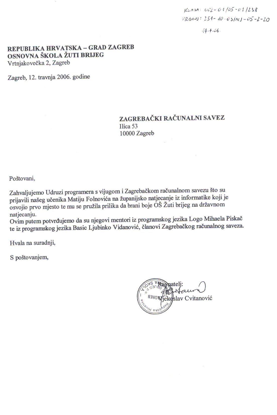 - dana 12. travnja u 15h putem telefonskog razgovora s ravnateljem OŠ Vrbani, u kojem sam ga podsjetio na obećanje da će se i pismenim putem očitovati na naš dopis KLASA: 602-01/05-01/238, URBROJ: 251-10-03/NJ-05-2-13 od 15. ožujka 2006., dobio sam informaciju da je državno povjerenstvo donijelo odluku da učenici koji za mentora imaju osobu koja nije zaposlenik učenikove škole, na državnome natjecanju neće moći zastupati svoju matičnu školu te da je onda bolje da i učenik OŠ Vrbani Karlo Dumbović na državnom natjecanju zastupa udrugu programera S VIJUGOM, članicu ZRS u kojoj je potekao, a ne svoju školu. (Ovu informaciju uzeo sam s najvećom mogućom rezervom, a ravnatelja upozorio na kvalitetu školskog izvora njegovih informacija o informatičkim natjecanjima). Školi je stoga upućen hitan poziv na očitovanje s rokom do petka 14. travnja.
