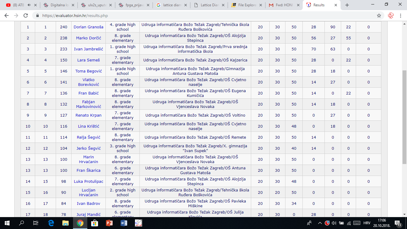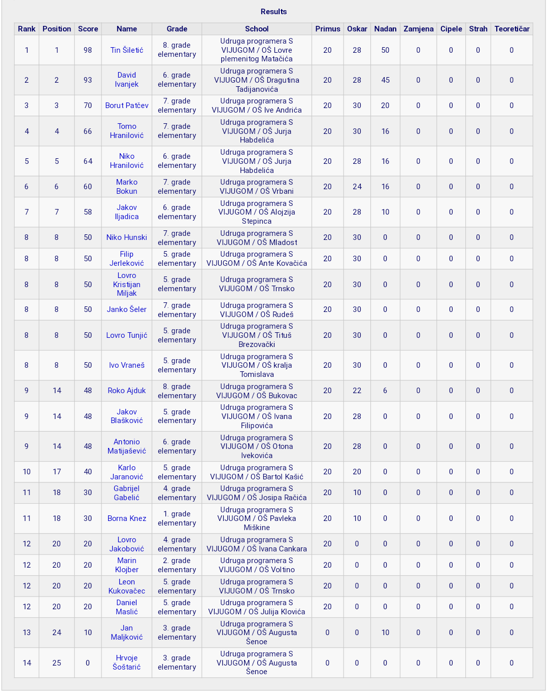Rezultati četvrtaša pokazuju da je Dino Hadžić imao izvrstan nastup sa 75 bodova, a Leona Granoša, koja je sjedila pokraj njega, osvojila je vrijednih 44 boda. Rezultati trećeša pokazuju da su i Hrvoje i Jan pogriješili na jednom zadatku, a prvašić i drugašić su napravili ono što su mogli.