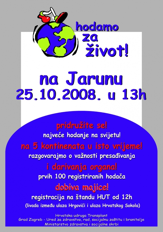 Kao jedan od inicijatora ovog svjetskog događaja Hrvatska udruga Transplant organizira hodanje po biciklističkoj stazi na Jarunu, uz kratki prigodni program. Start hodanja je točno u 13h sa livade između ulaza Hrgovići i ulaza Hrvatskog Sokola. Hodači se mogu prijavljivati od 12h na štandu HUT-a, gdje će dobiti redni broj. Prvih 100 prijavljenih "hodača" dobiti će majicu s logom akcije.