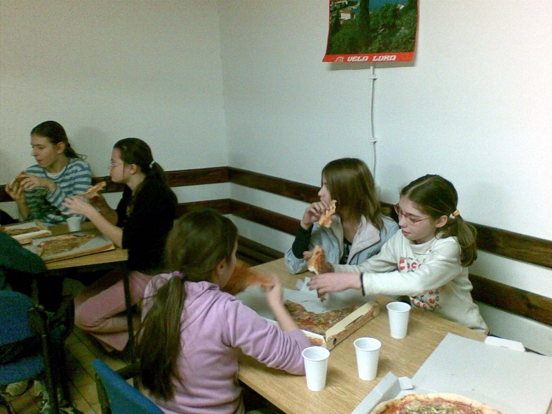 A u petak budu svakako pizze, njih osam lakih komada. Dopremit će ih neki lik oko 13:30 sati. Preuzet će ih Ivek i dati svakom nazočniku po jednu, a njemu kaj ostane. U nazočnike se računa i NLO.